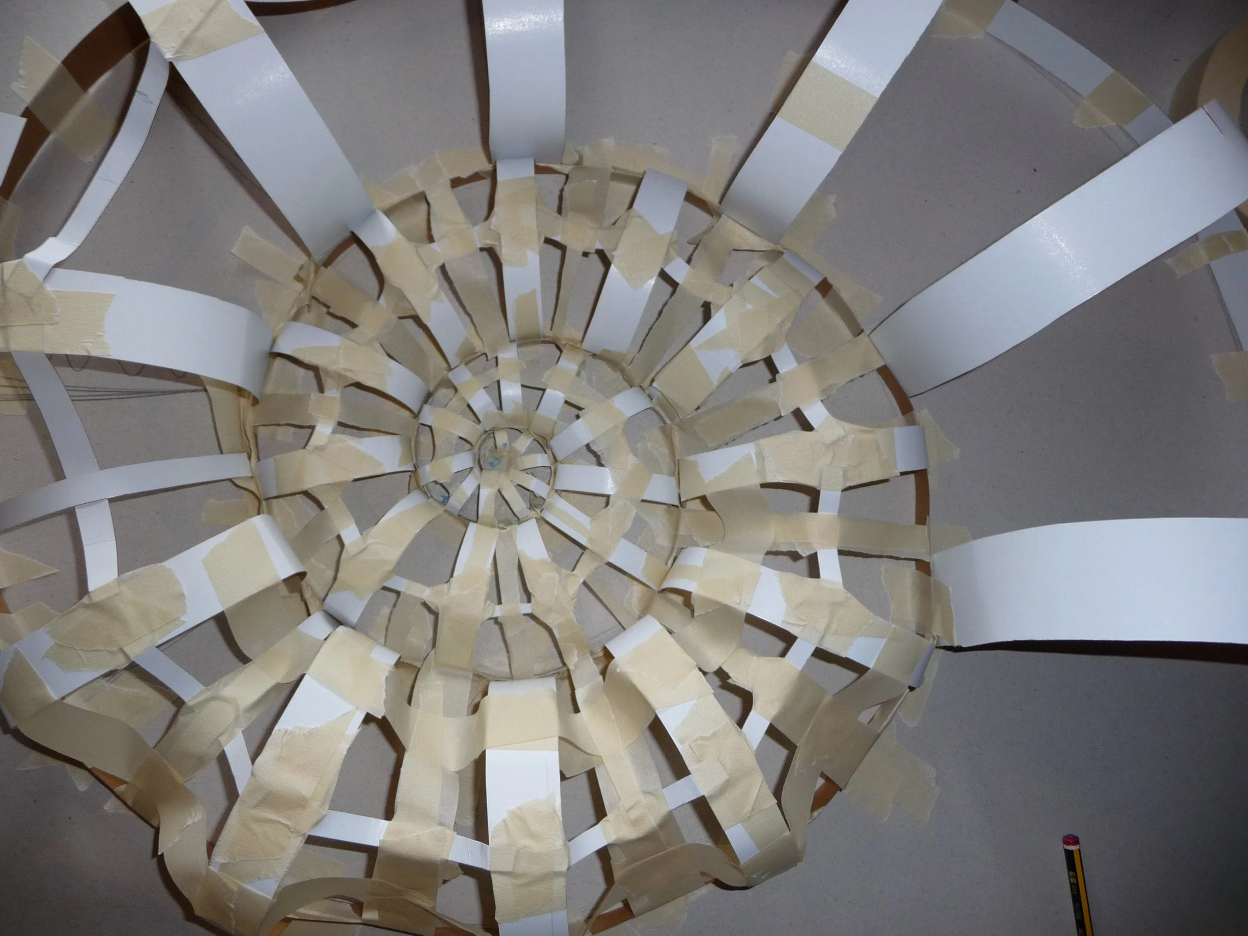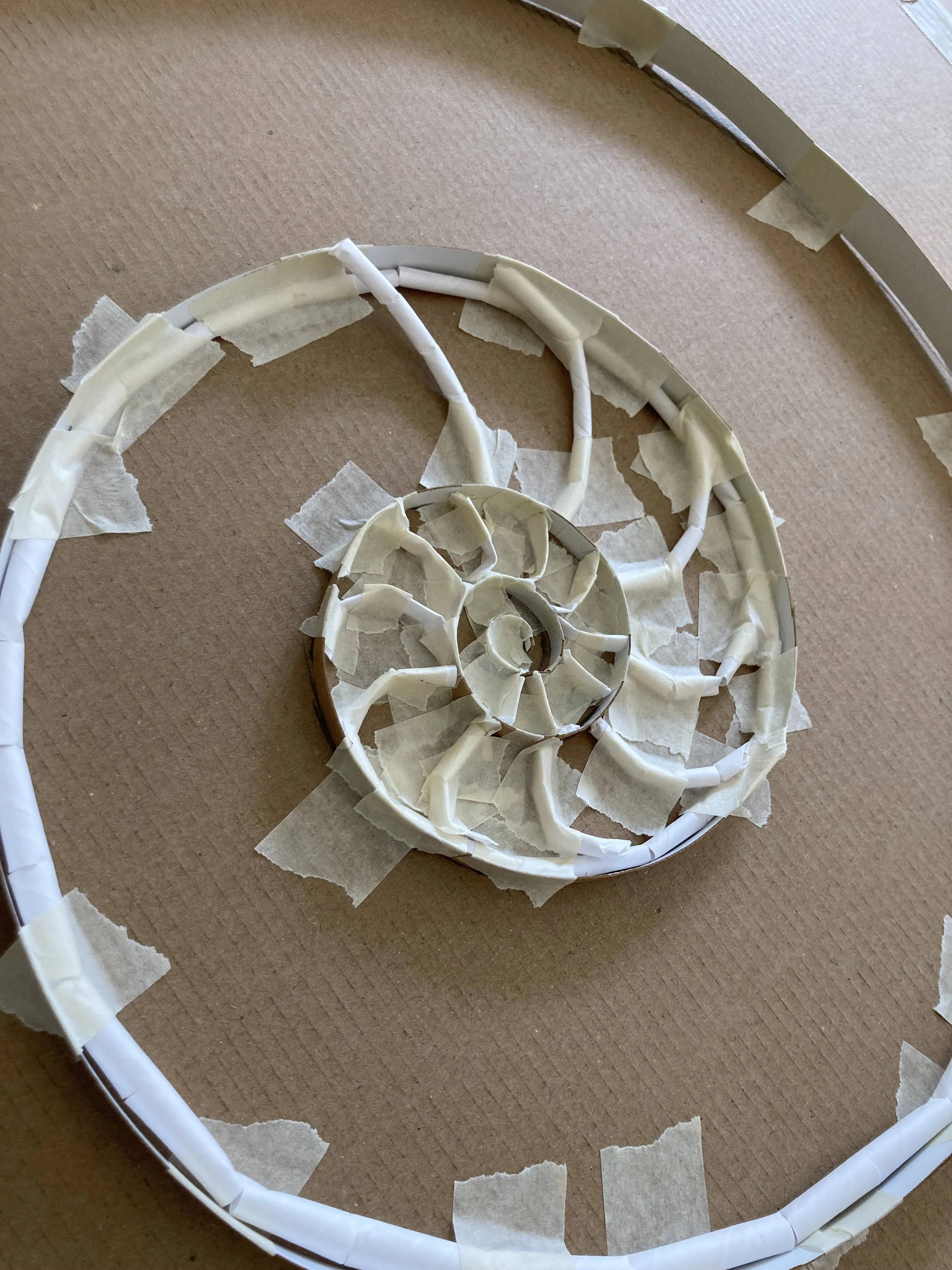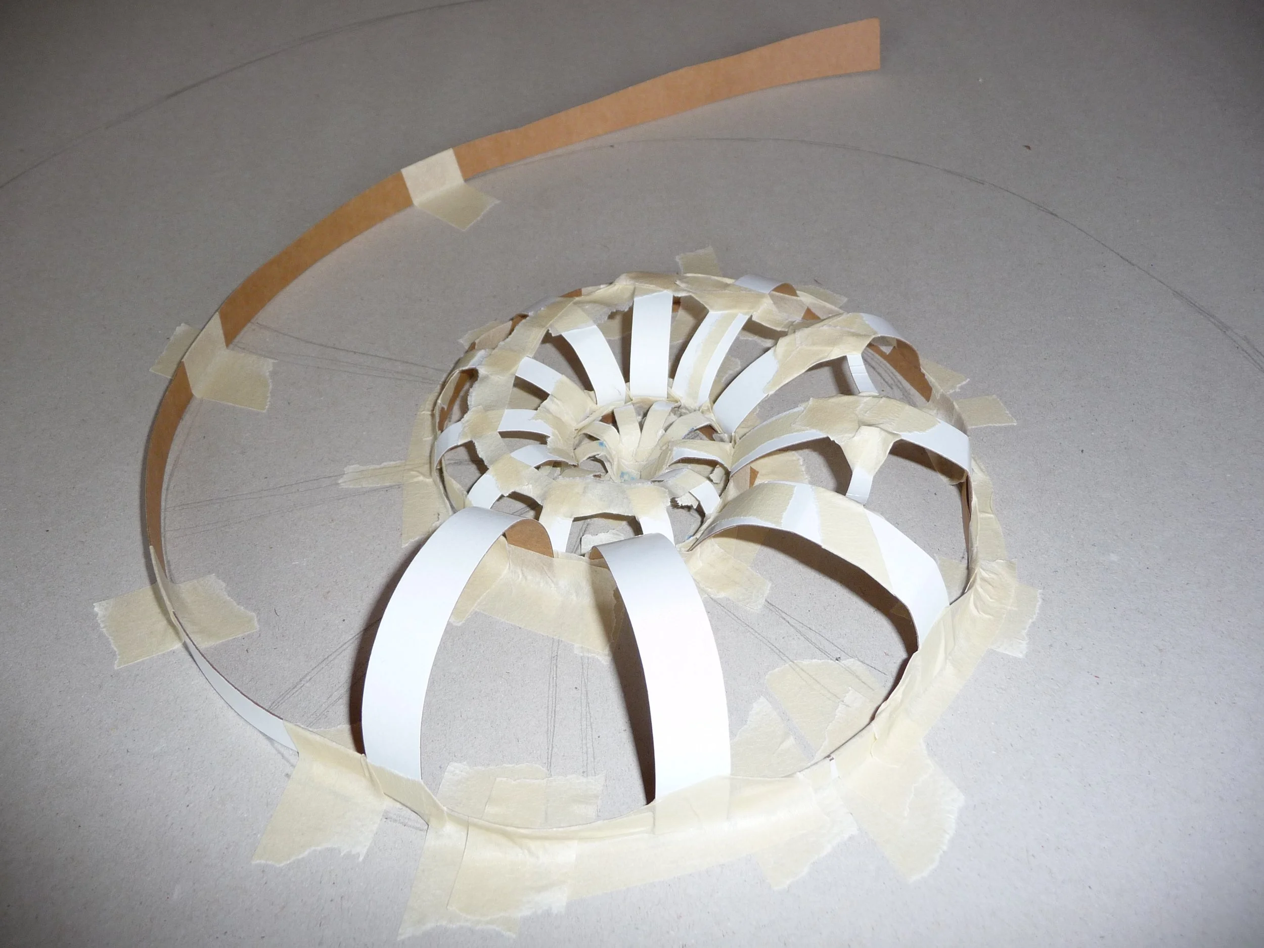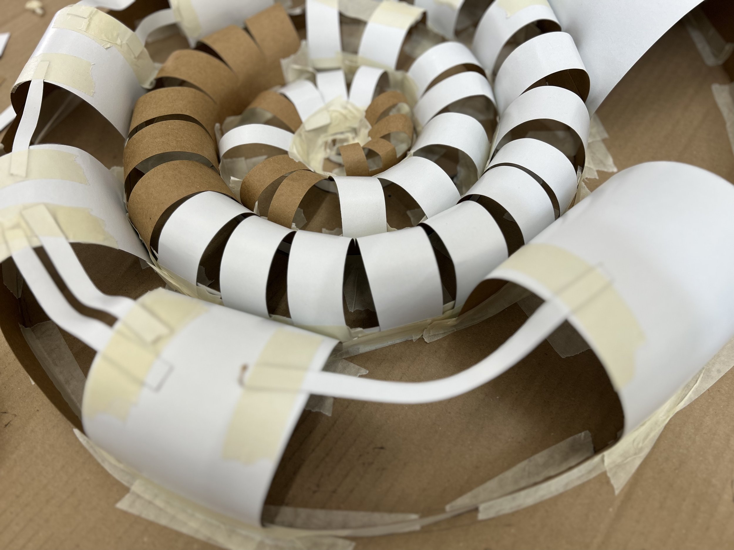The basic process I’ve used the most is to first create a simple ‘spiral’ shape from thin cardboard. Then to either build the flat ‘segments’ hidden inside, or the arch shaped ‘bridges’ over the shape to create a fully 3D version.