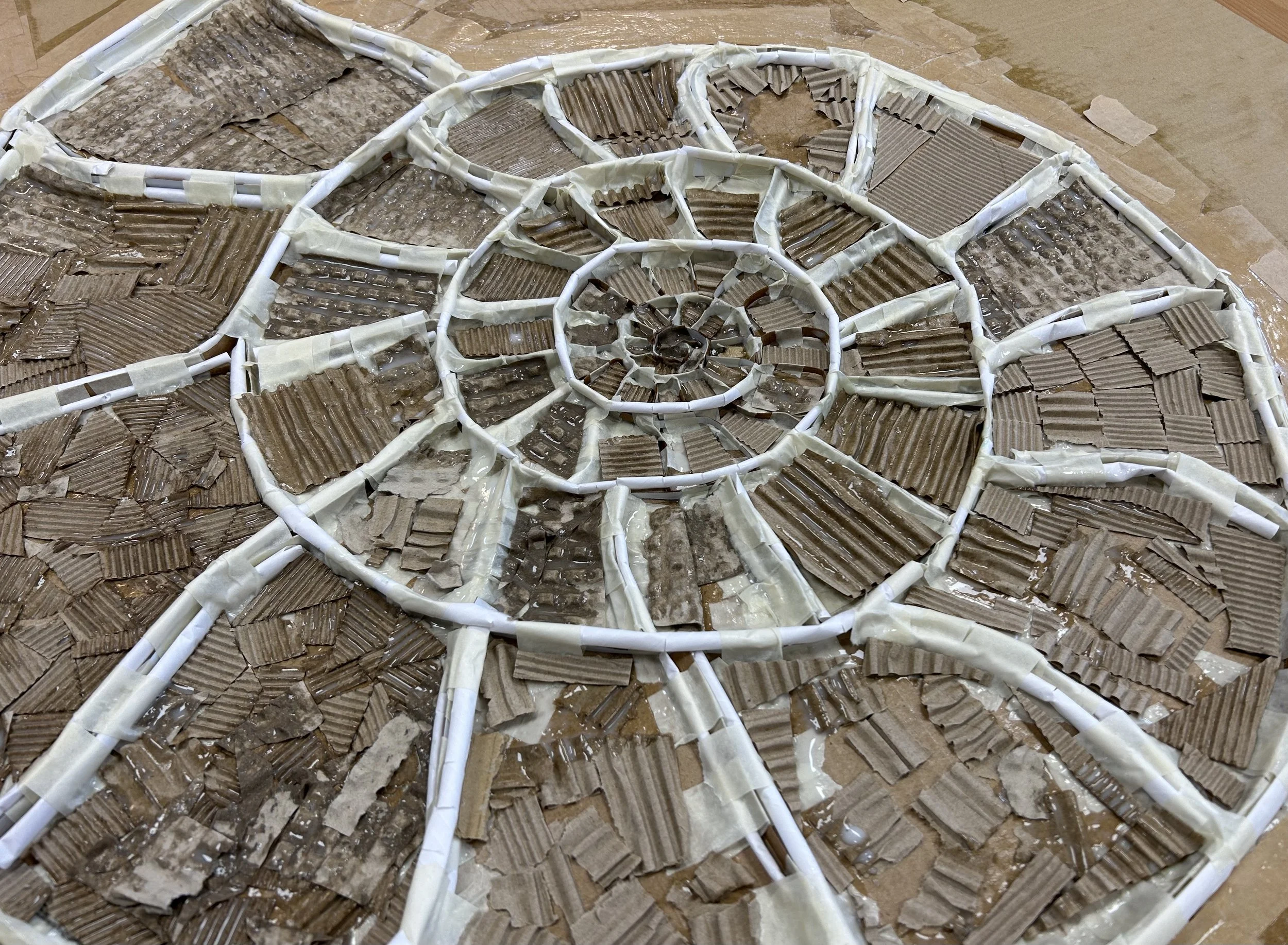 Okay, so the other basic way that you can begin the construction is to create a more three-dimensional design by building cardboard ‘bridges’ across the surface. This method begins in exactly the same way as the flatter version, with a thin cardboard spiral attached to the cardboard base.