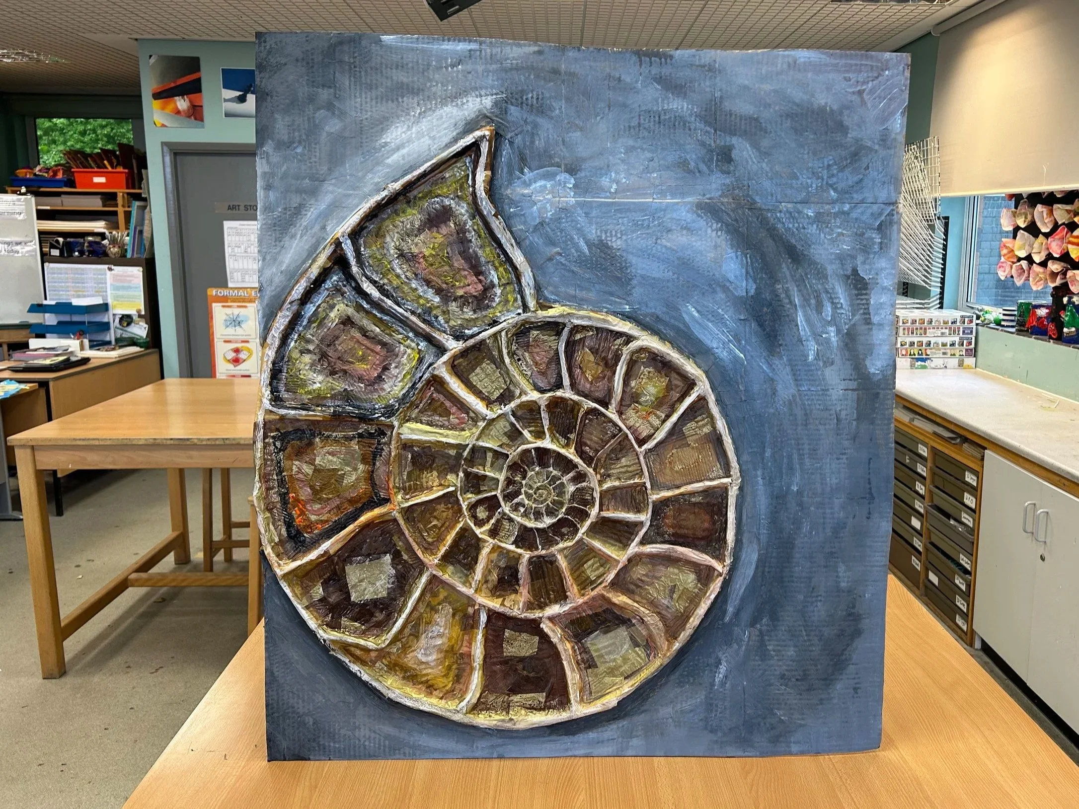 The children here have used cardboard strips and paper straws, then covered these with a layer of tissue paper (pasted on with a 50/50 mix of PVA glue/water) and then painted on top of their ammonites once dry.